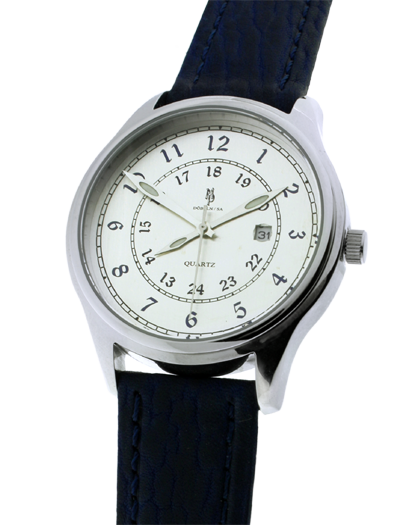 Hier haben wir mit einem auch von uns eingesetztem Quarzwerk, welches sonst eine 12-Stunden-Anzeige aufweist, eine erweiterete Anzeige bis 24 Stunden realisiert. Man muss in diesem Falle aber schon selber wissen, ob man Vormittag oder Nachmittag abliest. Dennoch finden wir, dass ist eine interessante Gestaltung - entgegen der sonst anzutreffenden Doppelangabe, an ein und dem selben Stundenstrich, also 3 Uhr und 15 Uhr.