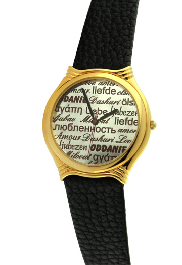 Sie ist unvergänglich wie die Liebe selbst. Und sie überwindet Raum und Zeit.Das Zifferblatt ist aus Silber lasergefertigt und in Handarbeit finisiert. Das Wort Liebe in mehreren Sprachen wurde mit roten Keramikverbundstoff ausgelegt. Schwarz lackierte Zeiger, durch ein Mineralglas geschützt werden von einem Quarzwerk angetrieben. Das Zifferblatt ist eingebettet in ein teilweise goldfarbenes Gehäuse aus polierten Metall.