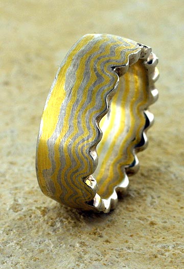 Mokume Gane Wabi Sabi Ring mit Gelbgold und Silber Wellen